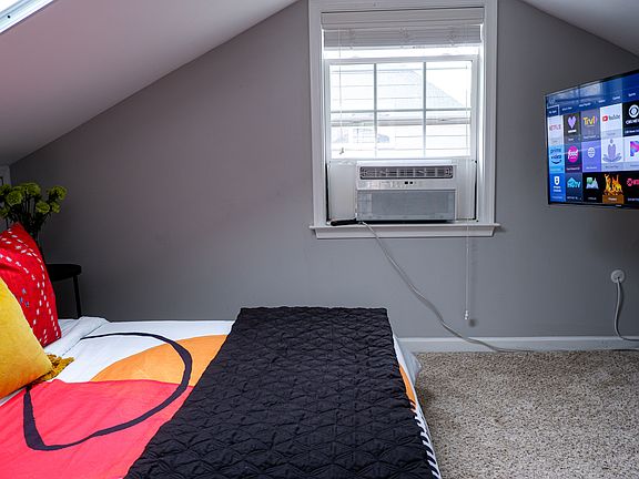 Bedroom 888 is a furnished attic bedroom. Features: sloped ceilings, a queen-sized memory foam bed, a dedicated writing desk, closet space, and a 43" Smart TV. A spacious shared bathroom and shared with just one other upstairs resident.