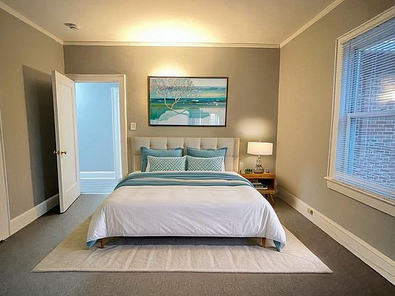 Queen size bedStainless steel appliancesWhite cabinetsRenovated kitchenBeautiful gray carpet