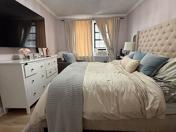 The building features an elevator for easy access, on-site laundry facilities, a gym to stay active, and a storage room for your extra belongings. Inside the apartment, you'll find modern upgrades including stainless steel appliances, elegant track lighting, and stylish crown molding, creating a sophisticated and welcoming atmosphere.