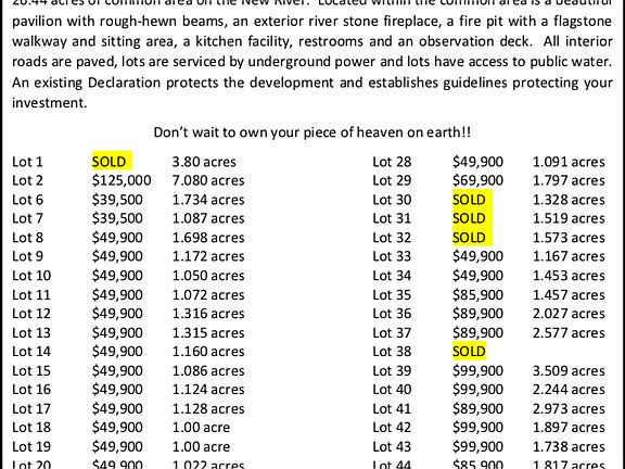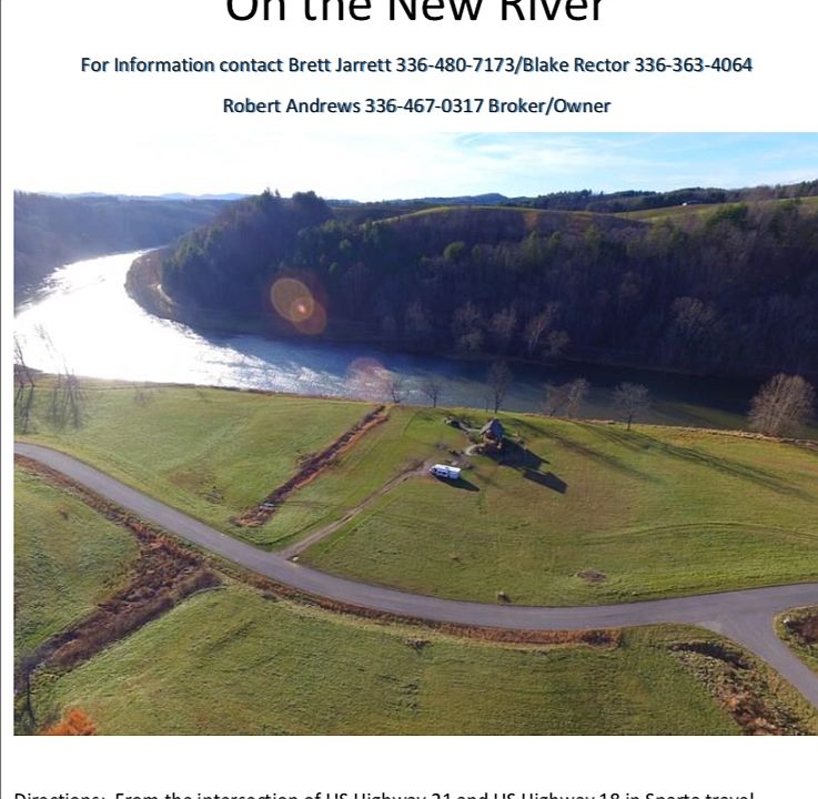 River Meadows Development is a 100 acre residential development located on the New River along the Virginia-North Carolina border. With spectacular views of the New River and the surrounding mountains, this property offers an excellent opportunity for your dream vacation home or your permenant residence. Lots range in size from one to seven acres and share in 26.44 acres of common area on the New River. Located within the common area is a beautiful pavilion with rough-hewn beams, an exterior river stone fireplace, a fire pit with a flagstone walkway and sitting area, a kitchen facility, restrooms and an observation deck. All interior roads are paved, lots are serviced by underground power and lots have access to public water. An existing Declaration protects the development and establishes guidelines protecting your investment.