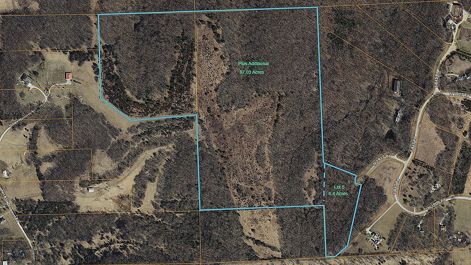 Platted lot #5, plus 87 additional acres of beautifully wooded upland area along the south bluffs of the Kaw River Valley, located in northwest Douglas County, Kansas.