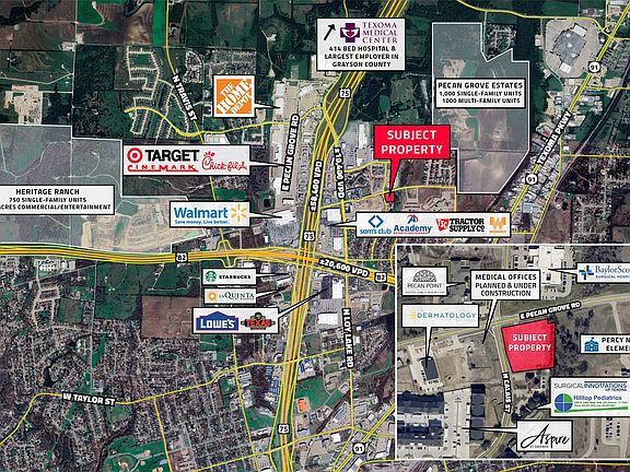 Excellent opportunity to acquire a prime 1.87-acre hard corner in Sherman’s medical hub. With over 500 feet of road frontage, the site offers exceptional visibility for a wide range of users. C-1 zoning makes the property ideal for medical or dental clinics, rehabilitation facilities, professional offices, or retail space. The tract is mostly clear of vegetation and free of floodplain per FEMA maps. The site is surrounded by a strong network of healthcare providers and complementary businesses, including Baylor Scott & White Surgical Hospital, Pecan Point Assisted Living, Hilltop Pediatrics, Surgical Innovations of Texoma, US Dermatology, North Texas Center for Women’s Health, and Innovation Surgical Solutions. Texoma Medical Center, Grayson County's largest employer, is just five minutes away.