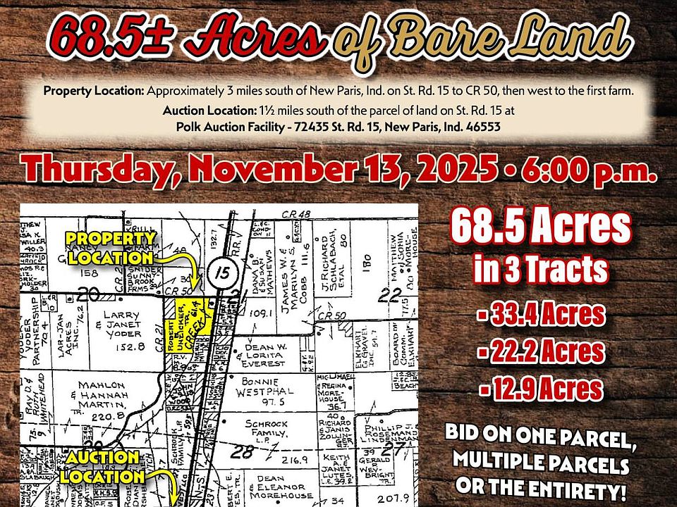 *THIS LAND IS UP FOR AUCTION ON THURSDAY, NOVEMBER 13TH AT 6:00 PM AT THE POLK AUCTION FACILITY: 72435 St. Rd. 15, New Paris, Ind. 46553. PRICE LISTED IS A SUGGESTED STARTING BID ONLY. SEE FLYER FOR MORE DETAILS ON THE LAND & AUCTION.