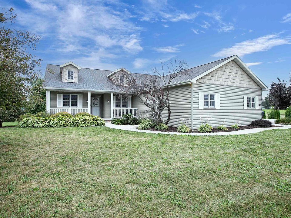 Discover exceptional living in this sprawling walk-out ranch, designed with a great layout and nestled on a 1.25-acre lot. Enjoy panoramic views from the 35' x 18' composite deck and 46' x 19' stamped concrete patio—perfect for entertaining or quiet relaxation. The open-concept floorplan offers seamless flow. The primary suite features a luxurious tiled shower, whirlpool tub, and a generously sized walk-in closet. The main level includes four bedrooms (or three bedrooms plus office) and a first-floor laundry. The walk-out lower level is a true showstopper, second gas fireplace, a large gathering room w/projector and screen, versatile rec/game area, custom-built wet bar, bedroom, full bath with upscale amenities. The heated garage offers EV Charger Wiring.