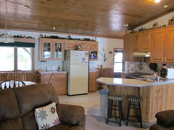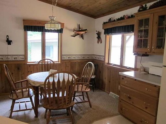 Lake Alice hillside ranch home with walkout lower level on 100' frontage on nicely wooded privacy lot. Detached two car garage with extra storage. Covered front porch with composite decking. Open concept main level great room with two patio doors to lakeside deck, dining area, kitchen with breakfast bar, 6 panel doors, custom pine cabinetry in kitchen area, full bath and two main level bedrooms. Downstairs offers family room with free standing woodstove, eye level windows, knotty pine den/office/company quarters. Full bath with large walk-in shower. The mechanical room adjoins family room with service door and overhead garage door with screens. All nice furnishings are included except for some art work and personal property of Seller. Good opportunity if you are a buyer looking for turn-key lakefront living on this very popular lake. new well and furnace 2009