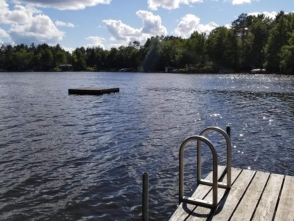 Enjoy water activities with sites and sounds of the lake, check out this opportunity. Waterfront property on the Popular Lake Muskellunge. Gentle slope from home to waterfront that offers sandy swimming area for wading or swimming. Enjoy your morning coffee or entertain family and friend on your deck (12x18) that overlooks the water. Year round Ranch style home with walkout lower level offers, 3 bedroom 2 bath Two 1car detached garages, plus storage shed. Eat-in kitchen, large living room with stone fireplace & patio doors to deck. Primary bedroom has it's very own master bath that is nicely updated. Added feature is garage has 2 220v service for campers, electric car charger or other needs. The dock/pier 40' long with swim platform & boat slip for large boat/pontoon could remain at site. Furnace approx 5 years, water pump 2020, water heater 5 years, part of shingles 2018 & remainder of roof 2006, larger garage roof 2016 & 200 amp service. Oct 2021 the drain field was expanded to be in compliance for a 3 bedroom system. Paved Road. Setup your showing & let the lake life begin!!!