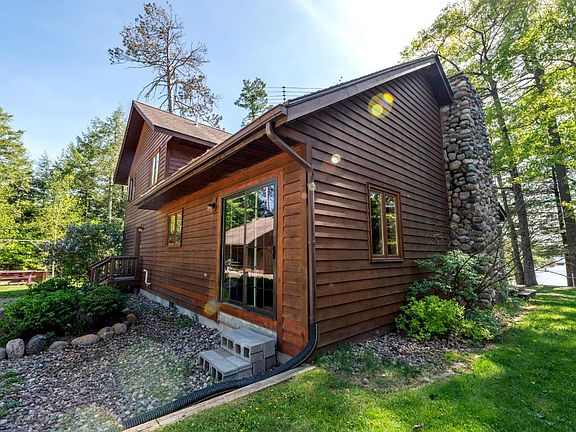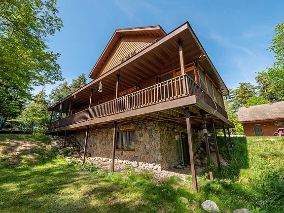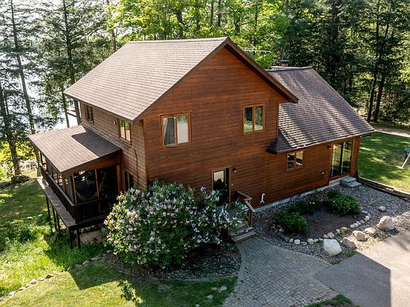 Imagine owning a Beautiful Cedar-sided Home on 4 ac. w/262' on Enterprise Lake! This custom-built home is the centerpiece of a 4-ac. wooded parcel w/lakeside decking, open and screened in porch, a pier and a dry boathouse. The private driveway leads to the charming grounds of rock gardens, shrubbery and perennials. Inside you will find all wood on the cathedral ceilings and walls and hardwood floors in the open concept living area. A full fieldstone woodburning fireplace accents the living room along with an open stairway that offers a 3-sided view of the living area. The impressive kitchen has hickory cabinets, quality appliances, and many showroom features. The main floor also includes a huge laundry/mud room, a sunlit den with 2 sets of French doors. The walk-out lower level offers a beautiful wood accented family room, full bath and a 4th bedroom with patio doors to the side yard. All this is facing west for Amazing sunsets!