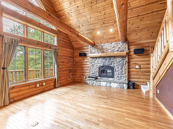Beautiful log cabin retreat on the Menominee River with 140 ft of frontage. This 2 bedroom, 2 bath home with a loft offers an open-concept layout, vaulted ceilings, and a wood-burning fireplace. The walk-out basement adds extra space and potential. Large windows bring in natural light and highlight river views. Outside, enjoy a hot tub, patio, wraparound deck, and detached garage. Part of Eagle Point Association, this property combines privacy, nature, and direct river access. Built by Wisconsin Log Homes.