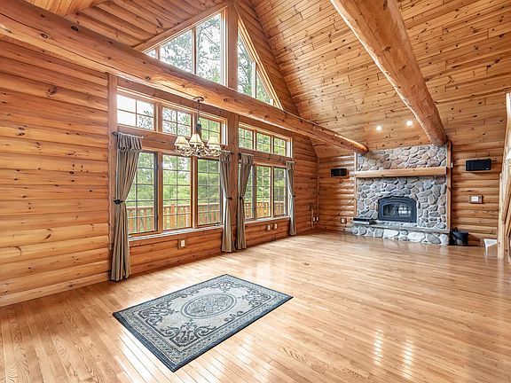 Log cabin retreatWalk-out basementHot tubDetached garageLarge windowsVaulted ceilingsWood-burning fireplace