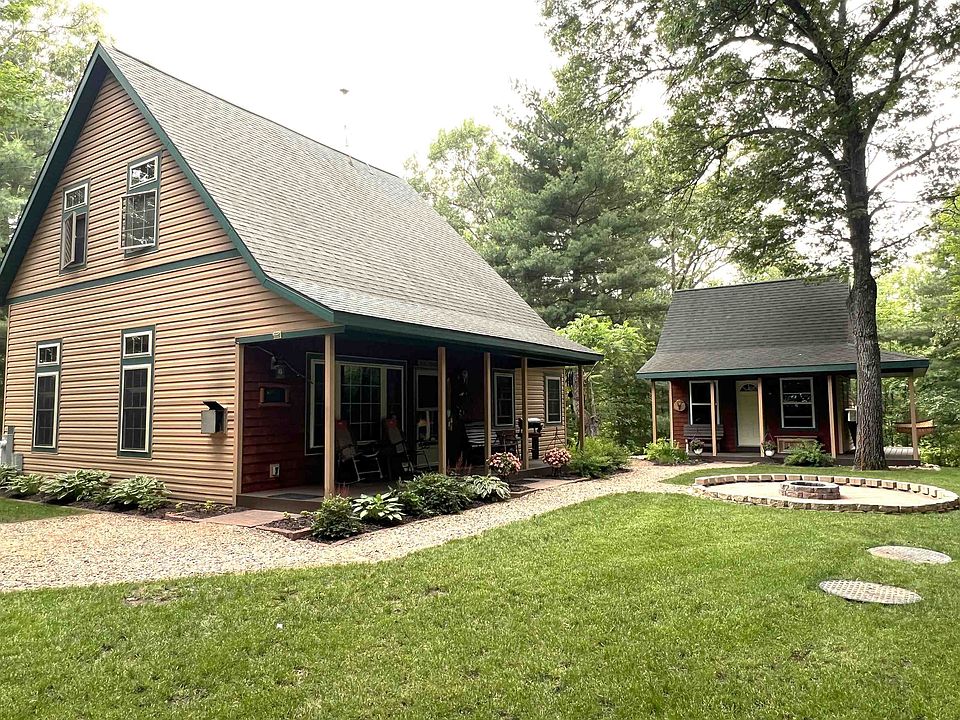 Custom cabin in the woods tucked across the street from pristine, full rec Stratton Lake. This open concept 2 story homes comes complete with 9' ceilings, lvp flooring, 1 1/2" pine custom island and counters, both gas and woodburning fireplaces, and newer appliances. On the main floor you can find the primary bedroom and bathroom. The upper level consists of 2 bedrooms, 1 bath complete with a tiled stand up shower, laundry room and plenty of storage. A 14x15 insulated workshop on the property offers electricity and an upper level for storage which could be finished off into a bunkhouse. Off the workshop is a 16x15 lean to for lawn equipment or kayaks. A years worth of wood, already cut and stacked comes with the property. Brick patio around fireplace and beautiful landscaping throughout.