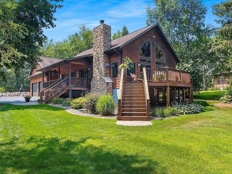 Outstanding custom built 2 bedroom, 2 bath home on a Legend Lake bay lot with over 100 ft of frontage, featuring over 2,000 sq ft, open concept living, stone fireplace, hickory kitchen cabinets and island, double patio doors to spacious deck, plus a covered front porch. Convenient 1st floor laundry, lower level office/den and family room with bar and pellet stove. Attached garage is finished with attic storage, yard is beautifully landscaped with stunning perennial gardens, irrigation system.