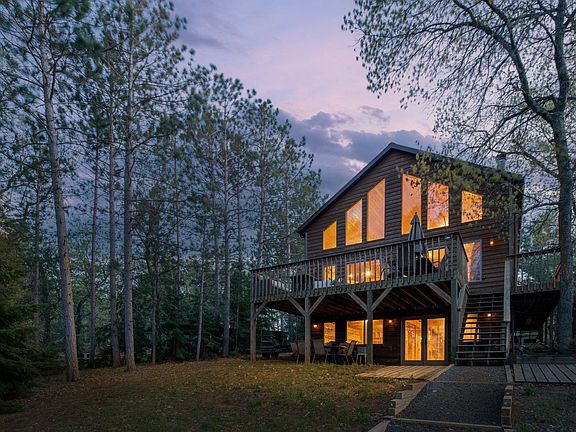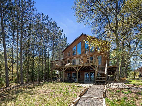 Discover your dream lakefront retreat at this stunning Cabin nestled on 32' of sandy lakeshore. Originally part of The Tota Resort, this property provides an idyllic setting for outdoor enthusiasts. Step inside to find 30' high ceilings, a charming pine interior, and stunning floor-to-ceiling stone fireplace. A wall of windows with breathtaking views of the Minong Flowage, a picturesque lake offering endless beauty and demanding sunsets. The outdoor gem of a space is simply relaxing with its expansive deck and lower patio, this property has something for everyone. With accommodations for 14+ guests, a main floor primary suite for ultimate comfort, or massive loft with tons of storage. The walk out LL awaits your creative ideas, complete to add 2 BRs. This Cabin is the ideal setting for unforgettable getaways just a short 2.25-hour drive from the Twin Cities or a quick 1-hour drive from Duluth. Whether you're seeking relaxation or adventure, this property promises a memorable escape!