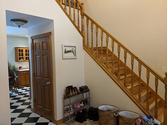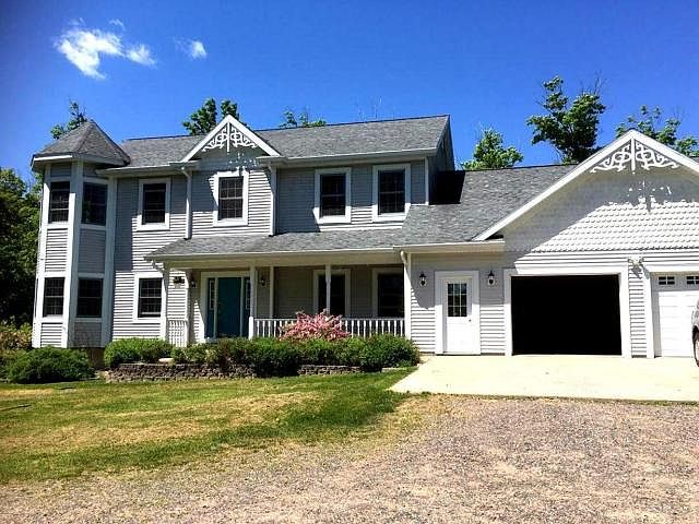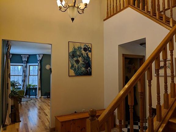 Country living has never looked finer! This home offers a hilltop setting with breathtaking sunrises and sunsets, wooded backdrop with walking/x country ski trail, a spacious yard with a sun deck, and plenty of room for gardening and play. The lot is well landscaped and has a concrete sidewalk and covered porch. Once inside, you will love the welcoming entry with wood staircase, upgraded hickory floors, and cozy living room with gas fireplace and turret/reading nook. The gourmet kitchen has custom wood cabinets, kitchen island, pantry, breakfast nook with doors to deck, and spacious dining room with high ceilings. There is a 4 season room, office and laundry room with walk in closet. Upstairs you'll love the Master Suite with full bath and walk in closet, turret/sitting area, and full size spare rooms with full bath. The lower level has family room, bonus room and bedroom as well as canning kitchen and 2 spacious storage rooms. There is an oversized 2 car garage/workshop...Great buy!