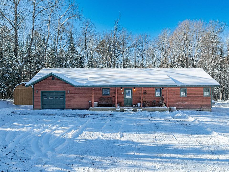 Outdoor enthusiasts MUST SEE this 3-bedroom, 2 full bath ranch style home on almost 11 acres adjacent to thousands of acres of Chequamegon Nicolet National Forest, and nearby Pike Lake Chain. UTV/ATV and snowmobile trails right out the front door. This location has so much to offer! This home was built in 2012 and features vaulted ceilings and knotty pine walls, wood burning fireplace, granite countertops, and custom cabinetry. Off the living room is a great 3 season room overlooking the back yard. The Primary bedroom with bath, 2nd bedroom, laundry area and another full bathroom finish off the first floor. The partially finished basement includes a bedroom with egress window and is plumbed for another bathroom. There is a large covered front porch and a concrete patio in back. One car attached garage, accompanies a 32x50 pole building. This is a rare property.