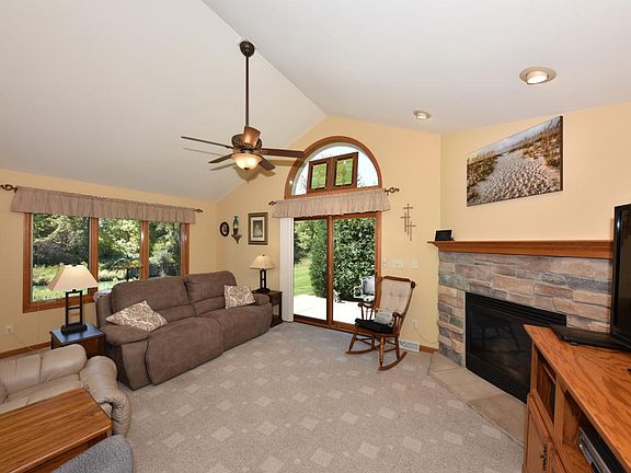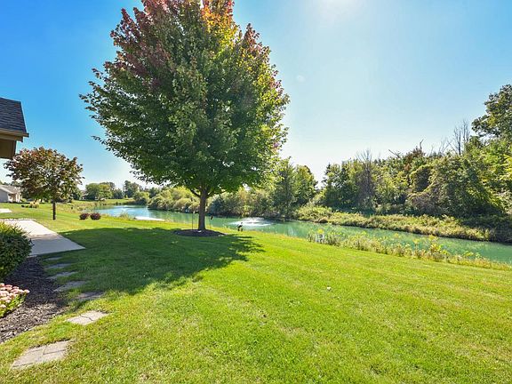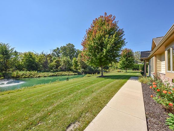 Lovely 2-bedroom, 2-bath condo overlooking a serene pond! Enjoy peaceful views right from your kitchen in this beautifully maintained home. Features include vaulted ceilings, gas fireplace; kitchen with island, beautiful breakfast bar, and quartz counters. Both bedrooms are complete with walk-in closets and shelving units. A charming patio surrounded by privacy trees is perfectly placed off the great room. Enjoy the ease of a 1st floor laundry and an attached 2-car garage, plus a full basement with egress window and already plumbed for a bath. Additionally, gain peace of mind knowing that the roof was replaced in 2023; furnace/AC new in 2021 and quartz counters in 2020. Quiet, scenic setting with modern comfort - don't miss it!