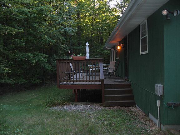 Legend Lake heaven, situated on a wooded off-shore lot, this well maintained three 3bdrm, 1 1/2 bath is perfect for the quiet weekend get away. Large living room, screen/storm windows on porch for additional space for everyone to enjoy. New roof this year, 2 1/2 car detached garage for storage & water toys. Walking distance to the Fox Ridge Beach club and the beautiful lakes on Legend. Large woodstove on the main level which will make the winter months warm & cozy. Front deck and fire pit add to the many nights around the campfire. Some furnishings included plus kitchen appliances included. Security system included. Full basement with painted cement floors.