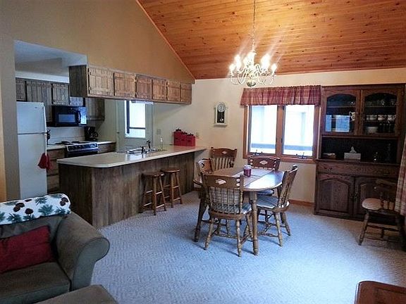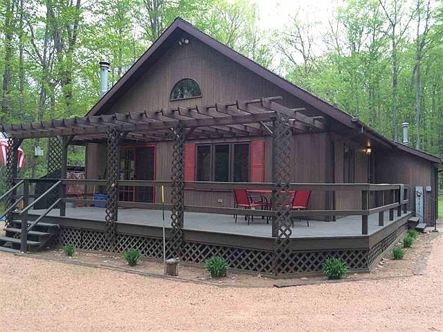 Immaculate 3BR, 2BA home or year-round vacation retreat on nearly 2 wooded ac. Open concept KT/LR/dining area, T&G vaulted ceiling, freestanding woodstove, BR/den w/French doors leading out to deck overlooking back yard, loft BR w/half bath, French doors from LR to front deck, and central air! Enjoy a beautiful view while relaxing on the front porch swing, or grab the marshmallows to roast while you visit around the backyard firepit. 2+ car det garage, woodshed, circle drive, & nicely manicured lawn. Snowmobile/ATV trail access directly from property. Beautiful, heavily wooded up north location within walking distance to full-rec Town Corner Lake and near 1000's of acres of public land. All appliances and most furniture included, so all ready for you to move right in! This is a must see for anyone looking for a full-time home or a vacation cottage.