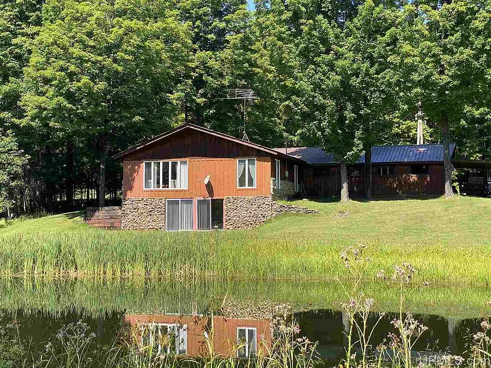 Beautiful country side! Picturesque setting with views overlooking your private pond! Two beds (with plenty of room to add a 3rd), tongue and groove vaulted ceilings with exposed beams above living room and master bedroom, stone fireplace in open dining area, ample cabinetry in large kitchen with center island, first floor laundry, & walk out lower level with family room. Screened in porch off of dining area. Two car attached garage. Shed and wood shed. Wonderful set up for entertaining! Pond is spring fed, addition.
