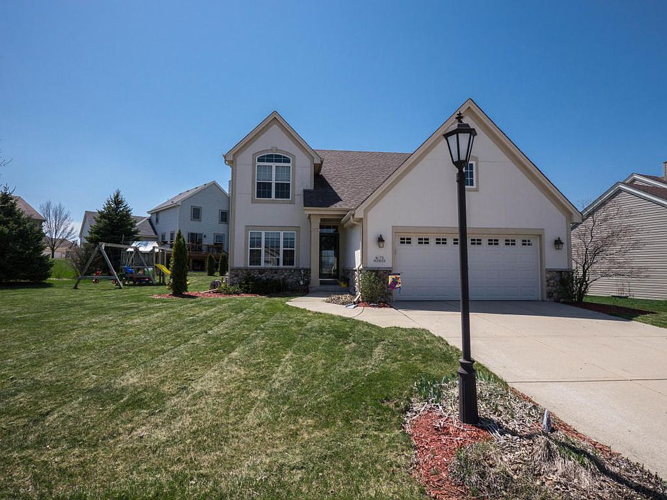 This 4 bedroom, 2.5 bath home features a gorgeous kitchen/dinette with granite counters, beautiful staggered birch cabinets, large center island, and pantry. Spacious living room with stone gas fireplace, plus den/office flex room and first floor laundry. Four nice sized bedrooms up, including master suite with double walk-in closets and tiled bathroom. Bathroom plumbed in LL, just waiting to be finished. Relax on the stamped concrete patio.