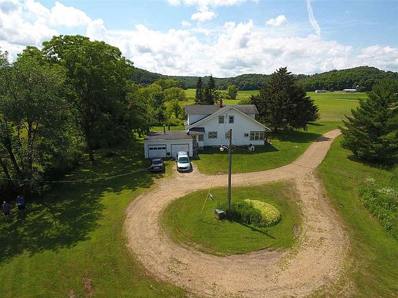 CHARM & COUNTRY COLLIDE! This 4BR 1.5BA is just what you have been dreaming about. 15 of the 50 acres are farmed so bring your animals, the rest is pasture/ wetlands & backs up to over 6sq miles of state protected wetlands. You will be singing like the birds w/ your own 1/2 acre pond within its completely quiet surroundings. Gorgeous views of Seven Mile Creek bluff & country sky. Home has hardwood floors, nice built ins, free standing wood stove & awesome front porch. Seller converted the 2car into living space/laundry but could easily convert back to garage. There's also a large machine shed used as storage/garage, milk house & old silo.