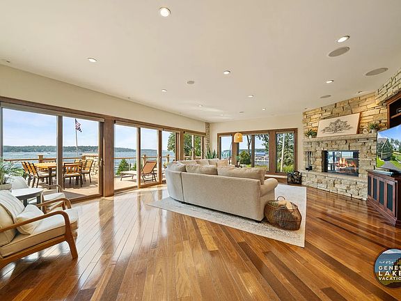 Inside, you'll find a spacious open-concept layout with a high-end chef's kitchen, elegant dining areas, and a lake-facing living room featuring a fireplace and floor-to-ceiling windows. Nearly every room offers breathtaking views of Geneva Lake, while thoughtfully designed bathrooms add refined comfort throughout your stay.