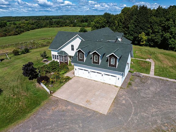 Located on 40 acres of picturesque countryside, this open, free-flowing 5-BR, 3.5-BA home offers over 7,000 sq. ft. of beautifully finished living space. Inside, you’ll find a chef’s kitchen with a walk-in pantry, formal dining room, breakfast nook, cozy sitting area, & a 3-season sunroom with stunning sunset views. The spacious living room features a wood stove for a warm, inviting atmosphere. The owner’s suite includes a luxurious tile shower & two walk-in closets. Upstairs offers even more space with a large family room, fun theatre room, 4 additional bedrooms, & 2 full baths. An attached heated 3-car garage, 48’x80’ pole building, 30’x40’ workshop, & multiple sheds—offer plenty of storage for equipment/hobbies. The covered front porch is perfect for relaxing while taking in peaceful country views. Ideal for a hobby farm, the property includes fenced pasture, horse stalls, and a chicken coop. Conveniently located near Shell Lake and other nearby lakes with sandy beaches, plus snowmobile and ATV trails.