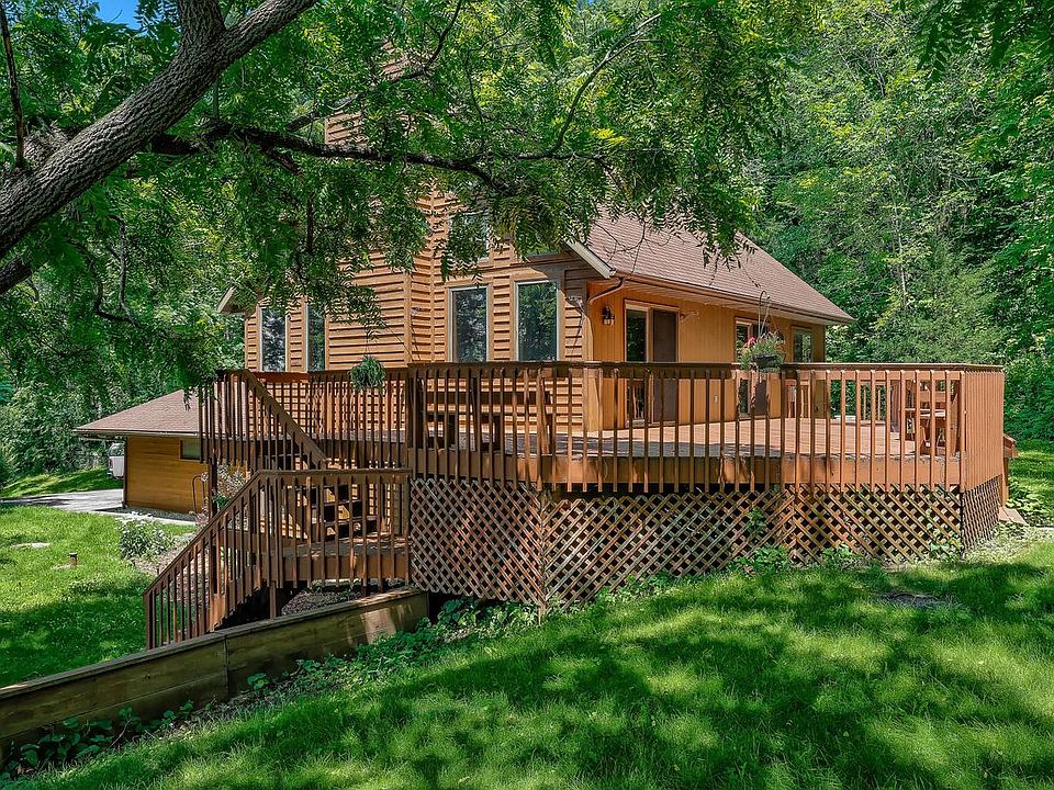 Enjoy the beautiful westerly views, sunsets and the Mississippi River from this cedar sided A-Frame built in 1990; nestled in the tree's just 10 minutes from south La Crosse. 1.5-acre private lot and large deck. Finished basement with 4th bdrm or den, large family rm w/fireplace -utility rm-bath. Main floor has an open concept living-kitchen-dining, vaulted ceiling with fireplace, 2 bdrms and full bath. Upper loft has a master suite and additional den/office space. Cedar siding was re-painted in 2024. With a little TLC, this home will shine and will make a beautiful place to call home for many years to come!