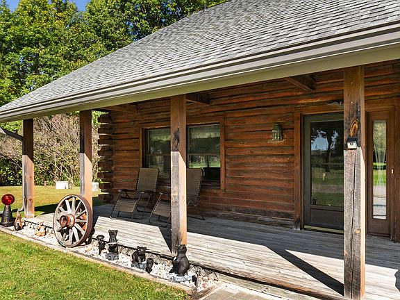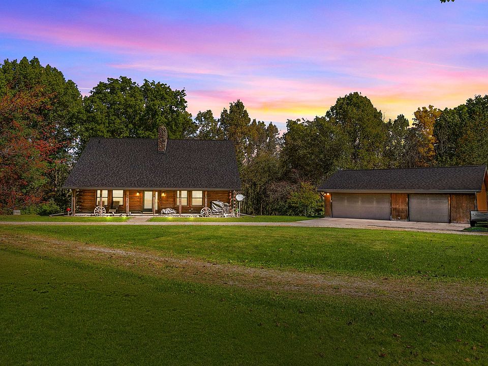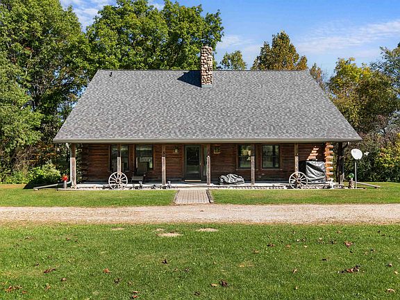 Experience the up-north feel with city convenience in this half-log home nestled on 3.2 scenic acres. Apple Creek winds through the property, adding to the serene natural setting. Step inside to an inviting entryway that opens to a stunning living room with a two-story fireplace and vaulted ceilings. The open-concept kitchen, dining, and living areas create an ideal space for entertaining. From the dining area, step out onto the deck and take in the peaceful views of the wooded acreage and Apple Creek.The main floor features two spacious bedrooms and a full bathroom. Upstairs, you’ll find a large loft area overlooking the living room and a primary suite. The unfinished walkout lower level is ready for your touches. The home is not located in a floodplain (FEMA cert). Being sold as is.