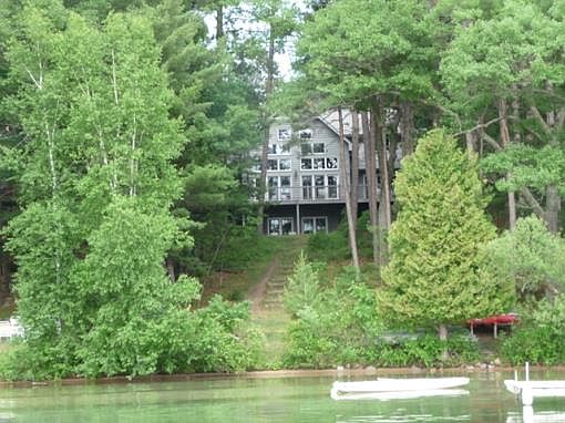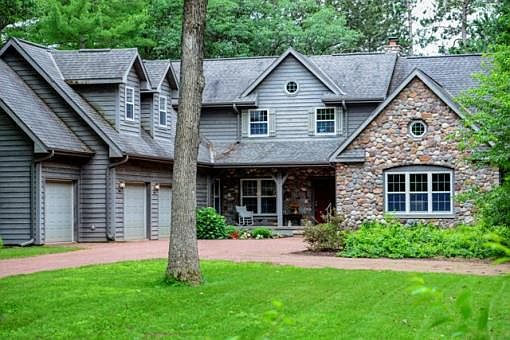 This Luxury Lakefront home has 72 feet of firm sand shoreline on the famous Chain O' Lakes in Waupaca, WI. This pristine lake frontage is matched perfectly by the well-appointed 6000 sq ft custom-built waterfront home. The design optimizes the waterfront view over Round Lake on all 3 levels of this 1-owner property. The main floor with open floor plan has a great room with 25 ft high ceilings and a wall of windows to the water. With nearly 200 window panes the beauty of the wooded setting and crystal clear waters of the glacial lakes is never out of sight. Westerly views provide magnificent sunsets over the full recreational lake. The grand entrance with slate flooring provides the first views to the water. It also welcomes you to the main floor with great room, formal dining room, deluxe kitchen with granite counters, laundry room, powder room, and well-appointed master suite. Details include maple and slate flooring, custom lighting, slip towel plaster finishes, cedar trim, Anderson windows and skylights, built-in bar, and a 2-story Wisconsin fieldstone fireplace. The second story features 2 large bedrooms and 2 baths, plus a bonus room for casual gatherings all with great lake views. The lower level also with windows to the waterfront has spacious family room with field stone fireplace, custom wet-bar, and glass doors to the patio and lakefront. LL also has bath with extra large shower to clean up after a day on the lake or after exercising in the LL fitness room. This home has zoned heating, sound and security systems, 3-car attached garage with basement access, workshop, wood pier, stone retaining walls, and custom landscaping. This luxury home offers fine detail yet provides an Up North experience with a wooded setting and access to 22 spring-fed lakes in central WI. Year' round recreation and natural beauty are endless, from waterskiing to ice fishing, with something for people of all ages and interests. Waupaca is located north of Madison approximately 2 hours or about 4 hours from Chicago. There is an airport in Waupaca and also in nearby Appleton (ATW) or Green Bay (GRB). Call Joe Udoni, Broker, at 715-281-8807 for personal tour of this Luxury home and/or the entire beautiful Chain O' Lakes recreation area.
