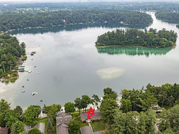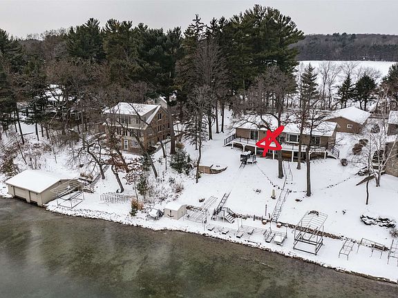 Chain O'Lakes Waupaca! Beautifully renovated 4-bed, 3-bath home on Sunset Lake with 105' of sandy shoreline, a maintenance-free pier, and a separate party dock. A new tram carries people and gear to the water, or use the stairs with a sturdy metal railing. Inside, enjoy solid-surface counters, luxury vinyl flooring, and tiled walk-in showers. The main floor features a primary suite with a walk-in closet, a second bedroom, full bath, and an open kitchen/dining/living area with a stone fireplace. A new 50' composite deck overlooks stunning lake views. The lower level offers two bedrooms, a family room with fireplace, laundry, storage, and a walkout to a patio with a boat-hull bar. Rare 3-car garage, level blacktop drive, workshop, and beautiful landscaping—move-in ready!