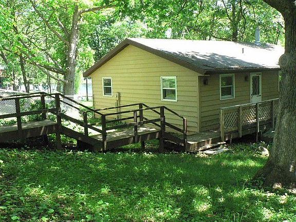 90' of lake frontage! Large lot with detachhed 2+ car garage. 2 bedroom, 1 bath with exposed walk-out lower level for additional bedrooms or family room. Main level is sunny & spacious, breakfast bar, large deck. All measurements are approx. Buyer to verify if important.