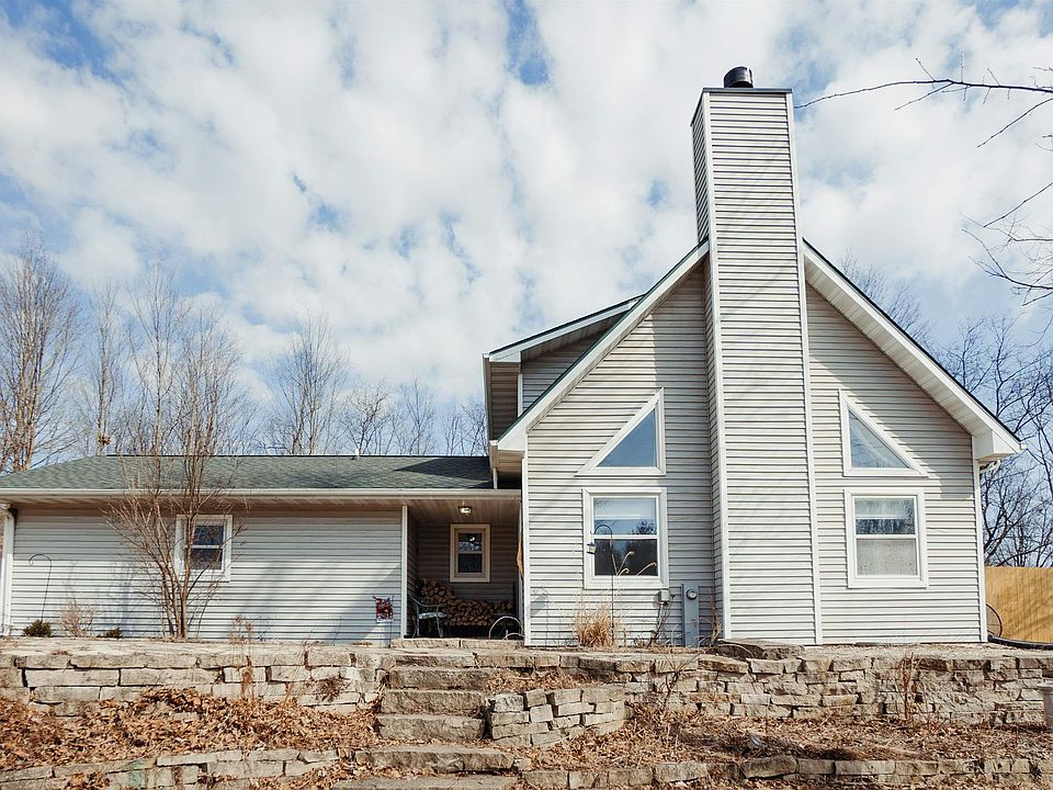 RUSTIC PARADISE!! Spacious 1.5 story A frame 3 bedroom with open concept kitchen with maple cabinets and Corian countertops and dining area that looks into the cathedral ceiling living room complete with knotty pine ceiling and stone front wood burning fireplace. Main floor master suite boasts walk in closet and 5 feet walk in shower. Main floor laundry. Open loft and 2 bedrooms upstairs. Partially finished lower level for additional living area. 2 car attached garage. 2.01 acres mostly wooded lot. Additional storage shed. $10,000 allowance for patio concrete if buyer would like to complete. Call today.
