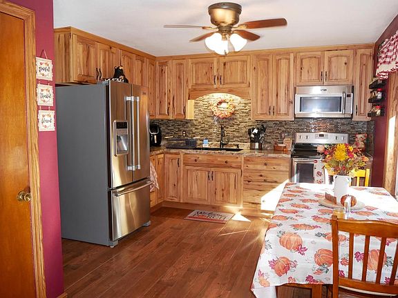 Partially finished basementBackyard viewsCustom hickory kitchenFront porchStainless steel appliancesTiled backsplashCampfire pit area