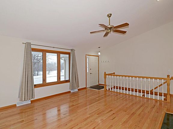 Country living at it's best. Built in 2001, this has been a One Owner Home. Rural one acre parcel with just one neighbor and lots of open fields and wildlife surrounding. This home has been completely updated. Includes Both baths new on the main level, new hardwood floors in the living, kitchen, dinette and master bedroom, new quartz counters, new paint throughout and a concrete driveway. Living room features open stairwell with hardwood stairs to basement, hardwood floors, vaulted ceiling and a fireplace. Lower level is totally finished with 2 bedrooms, 2 large living areas and a finished full bathroom. The basement is plumbed and ready for an additional bathroom, wet bar, or galley kitchen. Walk out basement allows for Lower level natural light and egress windows. All new flooring, doo