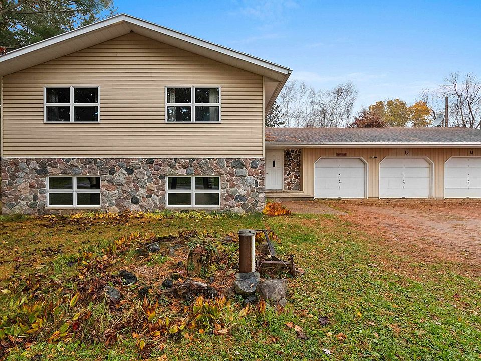 Enjoy the tranquility of the Embarrass River in your backyard with a walking bridge crossing to get the back of the property. This is a bilevel 3 bedroom, 1 1/2 bath home with main level laundry, spacious living room, kitchen/dining with patio door to deck, lower level family room with wood burning fireplace and large 3 stall garage. Carpeting has been removed in an upper level bedroom.