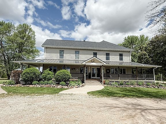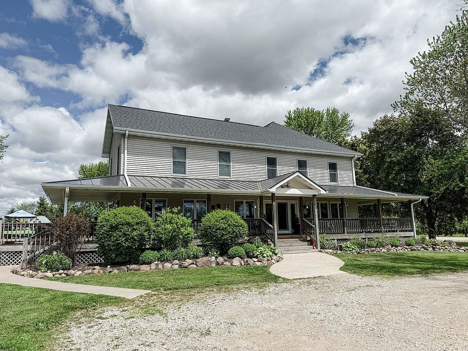 Renovated 5BR/3BA farmhouse on 5.5 acres— Enjoy country living with an easy 30-minute drive to all Fox Valley destinations. Ideal for a hobby farm or turnkey homestead! Open-concept layout, updated kitchen with solid-surface counters and island, spacious living area, and main floor laundry. Master suite with private bath, bonus room, and large wrap-around porch. New 36’x72’ outbuilding with in-floor heat lines, 30’x20’ horse barn with 1-acre pasture, and chicken coop with run. 54’x54’ organic no-till garden with strawberries and asparagus. Wildlife, woods, and room to grow!