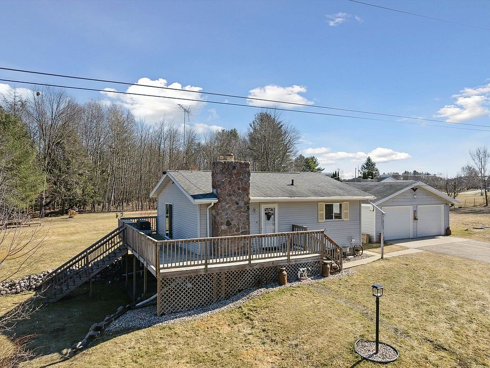 Wolf River Retreat! Surround yourself with views of the Wolf River, perfect for fishing, swimming kayaking and more! Situated on over an acre, it's perfect for starting a garden or gatherings around the fire pit. Conveniently located just a few miles from town with easy access to Hwy 29. Enjoy this quaint 2 bed, 1 bath with potential for a third bedroom in the walkout lower level. Deck located off the kitchen great for grilling out and taking in the river scenery. As you make your way through the home you will have a warm greeting with the open layout living room and kitchen featuring high ceilings as it allows an abundance of natural light to enter the home. This property also offers a 24x24 Garage. Don't miss your chance for life on the water, drive by and call today!