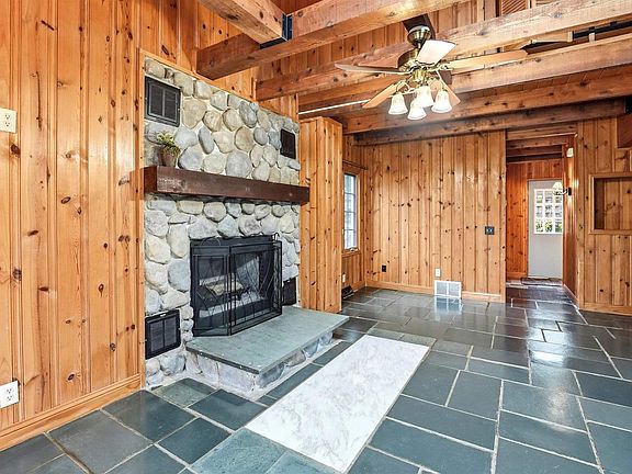 Private guest areaBright sunroomStunning stone fireplaceExposed beamsVaulted ceilingsPrivate backyard oasisSlate flooring