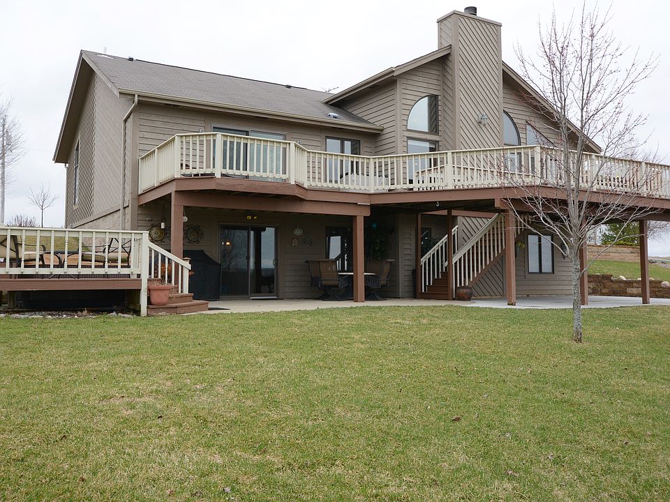 Comfortable living, quality construction and plenty of room for entertaining and family fun. The cathedral ceilings and walls of windows enhance the open floor plan. Stunning cherry cabinetry and Corian counters wrap the chef’s kitchen. An oversized dining area is open to the great room with a floor to ceiling brick fireplace and spectacular views. Sliding doors lead to a huge deck that overlooks a rolling countryside. The master suite also opens to the deck, and features a spa-like shower with multiple shower heads. The exposed lower level features a bar area, game space, family room and the 4th bedroom/ gym / office. The half bath is plumbed for a future shower. Relax on the covered lower level patio and separate hot tub deck. The hobbyist or sportsman will love the second garage. This heated shop/garage has built-in cabinetry and separate electric.