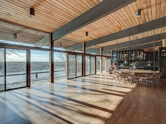 Discover a truly one-of-a-kind handcrafted retreat overlooking the Mississippi River. Designed and built by the seller, a retired architect, this timeless 4-bedroom home is filled with character, intention, and sweeping river views from nearly every angle. An open layout and expansive windows frame the home. Start your mornings on the large covered porch/deck, coffee in hand, watching eagles soar overhead. With additional side and front decks, you'll enjoy oodles of outdoor living space—perfect for relaxing, entertaining, or simply taking in the breathtaking views. Inside, the spacious kitchen is built for gatherings, featuring Cambria countertops, ample cabinetry, and a custom built-in table with seating for up to 12. The adjoining great room offers a beautiful stone fireplace, making this the ultimate space for hosting family and friends. Stay warm and cozy all year with both forced air heat and a wood stove. The lower level surprises with a second wood-burning fireplace in a large flex room that can function as a bedroom, recreation room, or inviting guest suite. A generous storage room and a workshop connected to the garage provide exceptional space for hobbies, projects, and organization. Homes like this rarely come along—thoughtfully crafted, beautifully maintained, and set on one of the most stunning stretches of the Mississippi River. This property is truly a must see!
