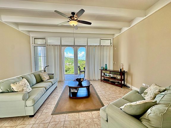 This spacious and charming 3 bedroom, 2 1/2 bathroom two-story corner unit is move-in ready. Enjoy a large gallery with a view of the green valley and a private courtyard in the back. The unit comes fully furnished with A/Cs throughout, a dryer, and a brand new washer. The upstairs split A/C unit was installed Dec 2024. There is designated parking right in front of the walk-in unit and multiple guest parking lots.The fully gated Questa Verde Condo complex offers a large pool and community area, an on-site office, an automatic back-up generator, trash pick-up in front of your, unit and monthly pest control. It is pet-friendly.The complex is conveniently located, close to Christiansted town, Beeston Hill Gym, Sunny Isle shopping Center and beautiful sandy beaches.