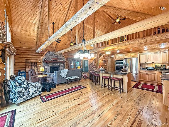 Experience the perfect blend of rustic charm and modern comfort in this stunning luxury log home set on over 20 wooded acres with nearly 1,600 feet of Sturgeon River frontage! Direct walk-down access to the river makes kayaking, fishing, and year-round recreation effortless — plus, you’re just steps from Michigan’s trail system for four-season adventures. Boasting nearly 3,700 sq. ft. of truly exquisite living space, this dream home features soaring cathedral ceilings with exposed log beams, gleaming hardwood floors, and an open-concept great room with a newer gas fireplace insert. The upper-level primary suite includes a full bath and is paired with a cozy loft sitting area, ideal for a home office or quiet retreat. The main level offers two additional bedrooms, a full bath, laundry, and a spacious kitchen/dining area that flows onto a massive deck overlooking the river — perfect for gatherings or quiet mornings with a view. Downstairs, the finished lower level is made for entertaining with a rec room, wet bar, custom built-ins, a guest sleeping area, and a stunning bath with a stone-and-ceramic walk-in shower. A heated, oversized two-car detached garage completes this exceptional property, offering both comfort and practicality.