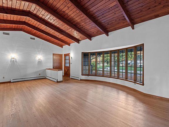 Versatile bonus areaLarge rec areaBuilt-in cabinetVaulted wood-paneled ceilingTall ceilingsAccent wallCherry cabinetry