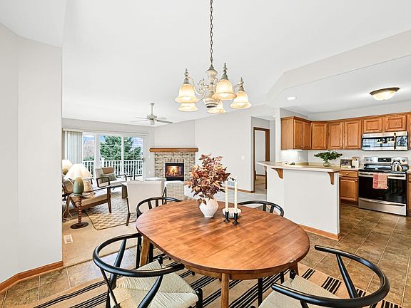 Welcome to this beautifully maintained ranch-style condo in the desirable adult 55+ Village at Brandon Oaks community. This light-filled 2 bedroom, 2 bath home offers vaulted ceilings, an open living and dining layout, and a cozy gas fireplace. The spacious kitchen features oak cabinetry and stainless appliances, with a breakfast bar overlooking the main living area. Step out onto the private balcony and enjoy peaceful, tree-lined views. The primary suite includes generous closet space and a full bath, while the second bedroom is ideal for guests or a home office. Additional conveniences include in-unit laundry, a private 2-car garage, and low-maintenance living with lawn care, snow removal, and exterior upkeep handled by the association. Move-in ready and easy to enjoy!
