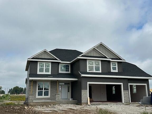 New construction Madison series with large 3+ car garage space in scenic October Fields neighborhood finished framing stage with expecting end of year completion. Vaulted ceiling in foyer with 9' ceiling thru first floor area space. 2nd floor laundry with open 2nd floor design. Guest bedrooms are spacious with private family bathroom. Primary bedroom cathedral ceiling with 2 walk in closets & private bath suite. 8' poured concrete foundation with 50 gallon water heater, high efficiency furnace, 200 amp electrical panel, roughed in drains for lower level. Option to select majority of interior finishes at this time. Exterior per plan is James hardie plank cement board siding, partial stone facade, with board and batten on gable areas.