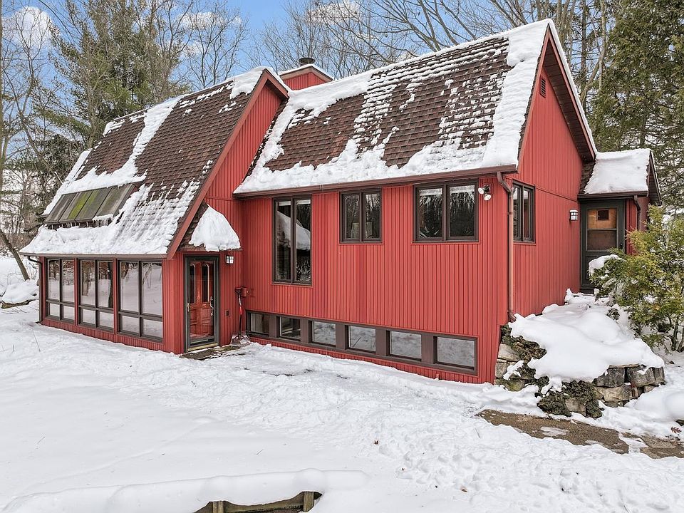 Set on a 1.23 ac wooded lot, this 4BR/2BA split-entry home features an open living space w/ wood stove, large kitchen island, and 4-Season room w/ cathedral ceiling! Primary bedroom w/ twin closets. Adjacent full bath & 2nd bedroom. Kitchen w/ breakfast nook, extra-large island w/ storage, appliances, and pantry. Large windows overlook the lower level. 4-Season room w/ unfinished floor & soaring ceiling clad in knotty pine has a great view of the natural scenery! Extra-large 3rd bedroom w/ wall of windows & unique accent lighting. 4th bedroom & 2nd bath complete the finished areas. Ample storage space & laundry room also on LL. Outdoors, the wooded yard also includes a patio & 2.5 stall detached garage w/ enclosed porch.