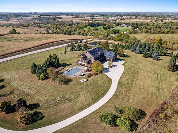 Absolutely gorgeous country retreat on 8.78 acres. This expansive 7,000+ sq ft, six-bedroom, five full baths, two half baths home blends luxury and comfort with timeless country charm. A chef's kitchen designed for entertaining features premium appliances, granite/ butcher block countertops, and a generous island, flowing into the airy great room with balcony views and abundant natural light. Three inviting fireplaces (two gas, one wood) add warmth and character throughout. The fully finished basement offers a stylish bar, game space, and media nook for gatherings. Outdoors, unwind in the inground pool with a whirlpool & slide, fish in the fully stocked pond, and store essentials in the 60' x 30' pole barn. A pristine blend of elegance, privacy, and rural serenity.