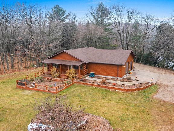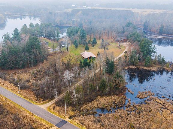 Enjoy Mother Nature from this secluded log home on 11 acres on a picturesque peninsula on Tilleda Pond with over 1,500' waterfront. This home offers over 2,300 sq ft featuring open concept living, cathedral T&G ceilings, 3 bedrooms, 3 1/2 baths, office space, main level laundry, large covered porch off the dining area, 2 1/2 stall finished garage and other garage/storage areas including 9'x24' lower level attached garage/workshop with walk-out, 24'x30' finished shop and a 40'x70' storage shed.