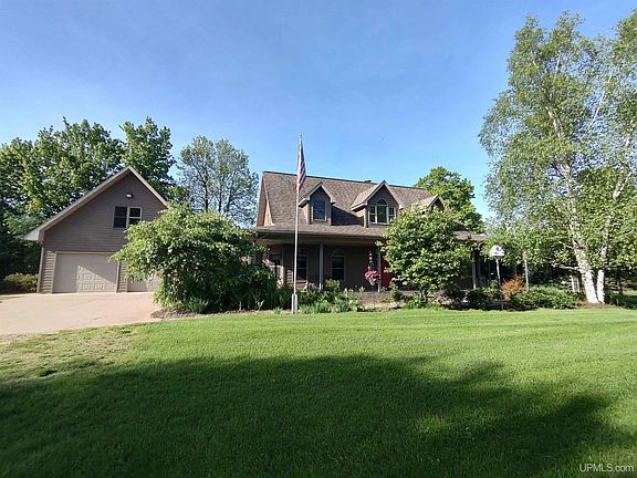 153 acres of paradise in the south central Upper Peninsula of Michigan, this unbelievable property of thick hard-maple forest is enhanced by a 2-acre pond stocked with trout, bluegill, and walleye. Aerated by one of two windmills the pond is at the headwaters of the Pecan Creek that runs into and out of it under a man-made dam. Three fields, totaling about 28 acres rest in the forest that provide opportunity for food plots and or farming. Fully accessible private roads and trails run throughout, and wildlife is abundant. There are three orchards and a 50‘ x 100‘ metal fenced garden. Irrigation is pumped from the pond. The well-groomed yard has 2 two-car garages. One is attached with a full upper room and one is a well-insulated, heated, and air conditioned shop 28 x 30. There is also a large pole building 54 x 32. The 2188 square-foot home was built by non-smokers in 2005. It has central air, 9 foot ceilings, a vaulted living room and foyer, hardwood flooring throughout the first level and carpeting upstairs. There are three bedrooms (master on first floor), 3 1/2 baths, laundry room with storage and a walk-in closet, a formal dining room, and an open concept living area. The kitchen boasts of cherry cabinets, black granite counters, Viking stainless steel commercial appliances with a double oven, a large walk-in pantry, and a large island with a veggie prep sink. The focal point of this area is a large masonry brick, wood fireplace. French doors lead to a screened in porch that opens to a large composite deck equipped with a built in grill and refrigerator. The master bedroom has a large walk-in closet, a full bath with walk-in shower, large whirlpool bath, and a large double sink vanity. The upstairs has a full bath and two bedrooms. The full basement has a game room, a sauna, a changing room and a full bathroom. There is an unfinished furnace room with electric panels and a set up for an extra washer and dryer. Furnishings are negotiable. This is a combination of land features and building improvements that will impress and satisfy even the most particular. This really needs to be viewed to grasp what it has to offer, so call to schedule your private tour today. Drone Link: https://youtu.be/ZApt82itK5c?si=10kR1ZSULdENki15 Virtual Tour: https://my.matterport.com/show/?m=SA2rLorWtav