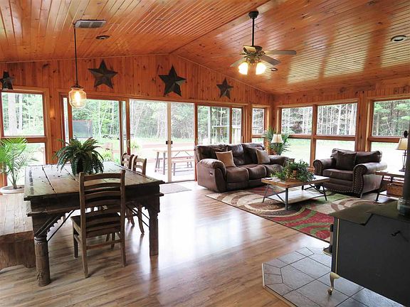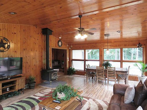 Looking to get away from it all? Check out this stunning home on 5 acres with deeded access to Lake Rollofson! Property offers an amazing sun/family room with tons of natural light, vaulted knotty pine ceilings and a wood burning stove. The family room opens to the living room with a separate 3 sided wood burning fireplace which is open the the updated kitchen with tons of storage, newer stainless appliances and a great island.Home features 2 bedrooms, one of which is a huge master bedroom with a separate master bath and laundry. Home has tons of storage in the unfinished basement which also has separate access to the outside. You will love the large front porch, deck off the master bedroom and huge deck off the family room. There are 2 detached garages, a 2 car and a 3 car that is insulated and heated with a pellet stove. With almost 1,700 square feet this home has a lot to offer, come check it out today!